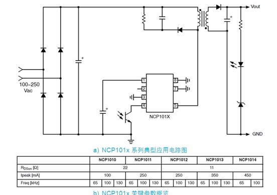 以 NCP101x 為例,這系列器件集成了固定頻率電流模式控制器及典型導通阻抗為 11 或 22 ? 的 700 V MOSFET,提供構建強固及低成本開關電源所需的全部特性,包括軟啟動、頻率抖動、短路保護、跳周期、最大峰值電流設定點及動態(tài)自供電(不需要輔助繞 組)等。在正常負載工作期間,NCP101x 以 65、100 及 130 kHz 中的某一頻率開關;而當電流設定點降到低于某個給定值(如輸出功率需求消失)時,NCP101x 自動進入所謂的跳周期模式(在此模式下跳除不需要的開關周期),從而提供極佳的輕載能效。由于進入跳周期模式通常發(fā)生在最大峰值電流的 1/4 時,故沒有可聽噪聲產生。因此,待機能耗降至最低,且沒有可聽噪聲產生。NCP101x 典型應用電路及不同型號的關鍵參數(shù)參見圖 2。