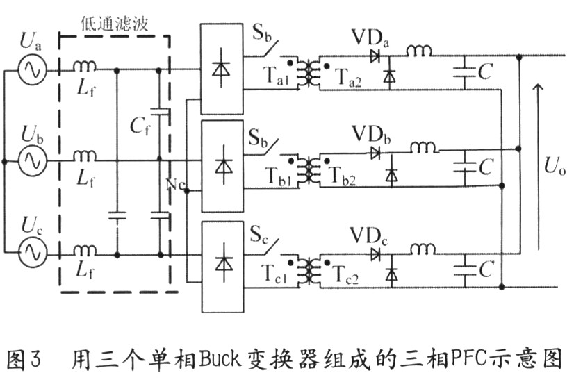 圖3用三個單相Buck變換器組成的三相PFC示意圖,圖3所示Buck型電路的結(jié)構(gòu)比較簡單,同全橋電路相似,由于隔離變壓器反射電壓的影響,其相對于反激電路來說也有較大的電流失真,但其諧波仍可以限定在比較低水平,達到IEC—1000的要求。另外,其可實現(xiàn)的功率等級的大小不如全橋高,但比反激式電路要大。