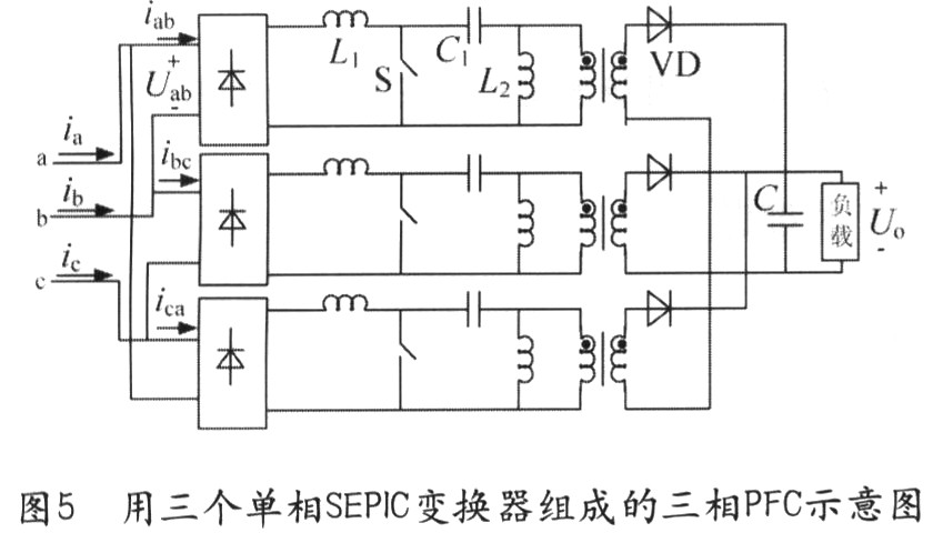 在Boost變換中,傳統(tǒng)的隔離在此種情況下的應(yīng)用并不理想,因為在電流連續(xù)情況下,器件將產(chǎn)生高的電壓應(yīng)力,在電流斷續(xù)情況下將產(chǎn)生較大的輸入電流失真。圖5所示的電路是用隔離SEPIC電路組成的三相PFC電路,SEPIC變換器的輸入端類似于Boost電路,因此具有Boost電路的優(yōu)點,如有低的輸入電流失真和更小的EMI濾波器。在輸出端SEPIC電路像反激式變換器,從而不必以增加電壓為代價達到隔離的作用。