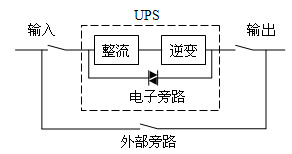 本系統(tǒng)設(shè)計(jì)利用美國(guó)山特公司3C3 UPS的特性,該UPS有一個(gè)內(nèi)部電子旁路檢修開關(guān),UPS在關(guān)機(jī)狀態(tài)下,電源是通過UPS內(nèi)部電子旁路直接輸出供電。外部再加一個(gè)旁路開關(guān)(圖1),外部旁路開關(guān)與內(nèi)部電子旁路開關(guān)形成并聯(lián)。UPS加入供電系統(tǒng)時(shí), UPS必須在關(guān)機(jī)狀態(tài)下,接通UPS輸入輸出端開關(guān),UPS與外部旁路開關(guān)形成并聯(lián)接通,然后斷開外部旁路開關(guān),再將UPS開機(jī)。UPS退出供電系統(tǒng)時(shí),必須先將UPS關(guān)機(jī),接通外部旁路開關(guān)(若UPS未在關(guān)機(jī)狀態(tài)下,相當(dāng)于UPS在開機(jī)時(shí)輸出端加入反向電壓,UPS可能燒毀),斷開UPS輸入輸出端開關(guān), UPS退出供電系統(tǒng)。這樣就很容易做到將UPS加入和退出供電系統(tǒng)中。
