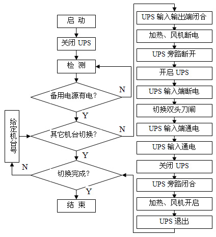 UPS的功率小于假捻機(jī)運(yùn)行負(fù)荷,在外部旁路開關(guān)斷開前,必須將電加熱和風(fēng)機(jī)電源斷開,降低負(fù)荷,保證UPS的安全運(yùn)行。否則系統(tǒng)負(fù)荷大于UPS功率的2倍,UPS自動(dòng)斷電自我保護(hù),造成切換中的假捻機(jī)斷電停機(jī),切換失敗。電加熱和風(fēng)機(jī)電源斷開后,斷開外部旁路開關(guān),UPS已加入到供電系統(tǒng)中,開啟UPS。為了延長(zhǎng)雙頭刀閘的使用壽命,使刀閘在不帶負(fù)荷的情況下進(jìn)行切換,雙頭刀閘切換前,將UPS的輸入端電源斷開, 此時(shí)切換中的假捻機(jī)已經(jīng)與外部供電系統(tǒng)全部斷開,假捻機(jī)傳動(dòng)系統(tǒng)由UPS電池組為其提供動(dòng)力電源,維持假捻傳動(dòng)系統(tǒng)的正常運(yùn)轉(zhuǎn),此時(shí)雙頭刀閘已經(jīng)空載,便可在無負(fù)荷的情況下順利切換。切換完成后,接通UPS輸入端電源,為UPS供電的電源已經(jīng)更換為備用電源,電源切換完成。UPS關(guān)機(jī)后再接通外部旁路開關(guān)、電加熱和風(fēng)機(jī)電源,將UPS的輸入輸出端接觸器斷開,UPS退出切換系統(tǒng),這樣一臺(tái)假捻機(jī)的雙電源切換已完成,再進(jìn)行下一臺(tái)假捻機(jī)的切換。