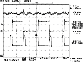 (b)圖中,示意了隔離變壓器副邊輸出的兩路驅動波形,可以直接驅動開關管。從圖中可以看出驅動波形比較理想:有快速的上升沿,并在一開始有一定的過沖,可以加速開通,減小了開通損耗;同時,有反偏截止電壓,提供了足夠的反相門極驅動,減小了下降時間;很好地驗證了驅動電路的設計是合理的。