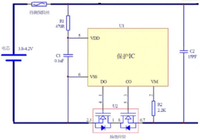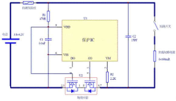 保護IC失效電路示意圖如圖2所示,此時保護IC對短路不能起到保護作用,當負載出現(xiàn)短路時候需要保險絲快速熔斷。