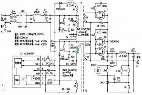 轉換IC選用了英飛凌公司第三代高整合功率集成電路——COOLSETF3系列產品ICE385565P,它在單一封裝中,結合了英飛凌COOLMOS功率金屬氧化層半導體場效應晶體管(MOSFET),與新型的脈寬調制(PWM)控制集成電路。待機耗電量較其他同類產品少l,3,適用于設計更具成本效益、效率更佳的供電系統。