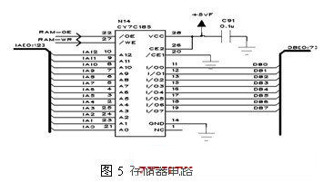 通過軟件參與設置,很容易得到全頻段內的預置誤差數(shù)據(jù)。對于2-20GHz的微波振蕩器,如果每隔5MHz設置補償一個點,那么存儲器至少需要3600個地址空間,在此選擇8k×8靜態(tài)存儲器芯片,存儲空間滿足要求。在時鐘的同步控制下,地址生成器產生對應地址,該系列數(shù)據(jù)被存入RAM中,電路如圖5所示。