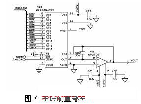 在主振預置電路D/A部分,為了照顧2-20GHz全頻段能有較為精細的預置分辨率,并且滿足△Data插值需要,在此選擇了14位D/A轉換器,使用時在數(shù)據(jù)范圍0~16383兩端預留一定的插值空間,電路如圖6所示。