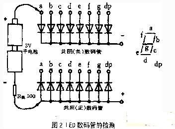 LED數(shù)碼管外觀要求顏色均勻、無局部變色及無氣泡等,在業(yè)余條件下可用干電池進(jìn)一步檢測(cè)。如圖2所示。以共陰極數(shù)碼管為例介紹檢測(cè)方法。;將3;V干電池負(fù)極引出線固定接觸在LED數(shù)碼管的公共陰極上,電池正極引出線依次移動(dòng)接觸筆畫的正極端。這一根引出線接觸到某一筆畫的正極端時(shí),那~筆畫就應(yīng)顯示出來。用這種簡單的方法就可檢測(cè)出數(shù)碼管是否有斷筆(某筆畫不能顯示),連筆(某些筆畫連在一起),并且可相對(duì)比較出不同的筆畫發(fā)光的強(qiáng)弱性能。若檢測(cè)共陽極數(shù)碼管,只需將電池正負(fù)極引出線對(duì)調(diào)一下,方法同上。
