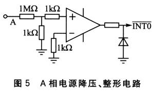 數(shù)字采樣方法具有數(shù)字濾波效果,對(duì)信號(hào)的通道干擾有抑制作用。設(shè)定每個(gè)周期采樣100個(gè)點(diǎn),由定時(shí)器T0產(chǎn)生采樣時(shí)間間隔。將系統(tǒng)某相進(jìn)線(xiàn)電源(如A相) 信號(hào)經(jīng)過(guò)降壓、整形電路如圖5所示,轉(zhuǎn)換為方波信號(hào)。作為單片機(jī)中斷0的觸發(fā)信號(hào),在正常情況下電源信號(hào)的頻率為50Hz左右,在兩次中斷期間,對(duì)剩余電流的采樣次數(shù)為100次。