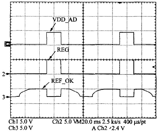 VDD-AD是檢測模塊的供電電壓,設計驅動能力為2 mA.芯片負載減小時,關斷REG,減小了芯片的靜態功耗,這樣既能保證芯片的驅動能力,又同時降低了芯片的靜態功耗。