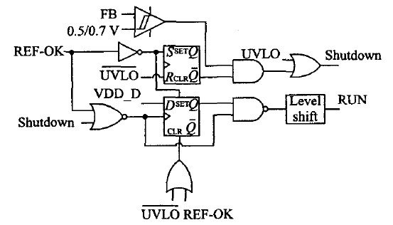 模式控制邏輯用以保證在進行模式選擇時,電源系統正常工作。當FB電壓底于0.5 V時,該控制邏輯通過內部電流滯回比較器自動選擇進入待機模式。RUN信號(其為高電位有效)用來關斷綠色多模式反激變換器中的其它控制模塊,以實現低待機功耗。