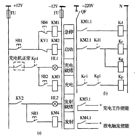 圖3(a)中,KM1-4為SSR,SB1-4為自鎖按鈕。系統上電后,通過按鈕SB1啟動KM1和KM2,這樣Kd將首先得電動作,隨后Kc、Kg、Kp也相繼動作,為下一步進行的充電工作做好了準備。圖3(b)中,Kc和Kg啟動采用了位置接點Kdl,同樣Kp啟動也采用了位置接點Kcl和Kgl,這樣設計目的是使控制電路具有了邏輯動作與防誤閉鎖功能。此時只要充電設備自檢正常(圖3(a)中"充電機正常"接點閉合),則燈HI 1指示可以進行充電,通過按鈕SB2啟動KM3便可對脈沖電容器組進行充電。脈沖電容器電壓達到預設值后,KV動作,常閉接點KV1斷開致使KM2失電,則Kc、Kg、Kp相繼返回,同時Kp返回又使KM3失電,這樣Kc、Kg斷開,充電機停止工作,滿足了系統放電前提。此時燈HL1熄滅、KV2接通,燈HL2指示充電完畢,通過按鈕SB3啟動KM4則可進行ETCG發射。