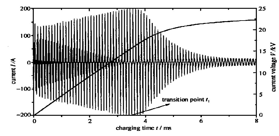 忽略回路電阻, 電路的特征阻抗為Z =√ L/C , 諧振周期為T r = 2π √L/C , 其中C 是諧振電容C r 和折合到原邊的負載等效電容C''串聯后形成的總電容, 通常因高壓變壓器變比高, 等效電容C ''和C r相比較大, 因此串聯后的總電容C 和C r 相差不大。完整的充電電流波形包絡及充電電壓如圖4 所示, 其中t1是轉折點, t1 以前是線性等臺階充電, t1 以前電流波形放大如圖5 (a) 所示, 轉折點附近的電流波形如圖5(b) 所示。