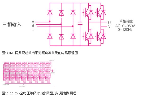 圖14(b)中,此變頻功率單元基本拓?fù)浣Y(jié)構(gòu)為交椫睏交型三相二極管不可控整流/單相逆變輸出的電壓源型變頻器,即此變頻單元是三相交流輸入,單相輸出為可控的交流0~950v。其中逆變器件可以是igbt(igct、iegt)。