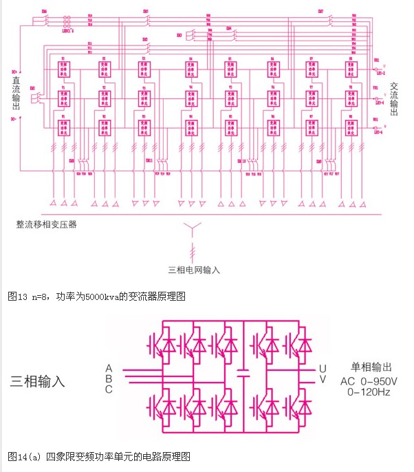 圖14(a)中,此變頻功率單元基本拓?fù)浣Y(jié)構(gòu)為交椫睏交型三相可控整流/單相逆變輸出的電壓源型變頻器,整流側(cè)為三相可控整流橋,將輸入的三相交流整流成直流;逆變側(cè)為單相逆變,實(shí)現(xiàn)單相可控交流0~950v輸出。此變頻功率單元能夠?qū)崿F(xiàn)能量的雙向流動(dòng),電流可從電網(wǎng)經(jīng)中間直流電容流向電機(jī),也可因電機(jī)制動(dòng)或電機(jī)工作在發(fā)電工況時(shí),電流從電機(jī)經(jīng)直流環(huán)節(jié)的電容流向電網(wǎng),實(shí)現(xiàn)四象限運(yùn)行控制。其中可控整流器件和逆變器件可以是igbt(igct、iegt)。