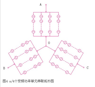 1/4全電壓等級如圖4所示,由n/4個(gè)變頻功率單元串聯(lián)組成1個(gè)變流鏈,每相由4個(gè)變流鏈相并聯(lián),實(shí)現(xiàn)1/4全電壓等級的三相交流恒功率輸出,其中n為偶數(shù)。