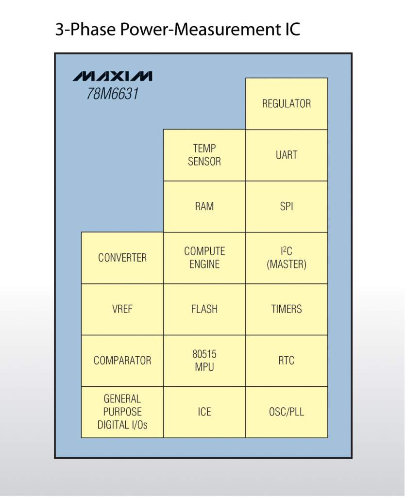 Maxim Integrated Products, Inc 推出Teridian三相功率測量片上系統(tǒng)(SoC) 78M6631,用于大功率負載的電能監(jiān)測。完全集成的可定制電能測量系統(tǒng)具有完備的測量和診斷功能,有效簡化設(shè)計、降低成本。78M6631適合各種需要監(jiān)測三相功率和供電質(zhì)量的應(yīng)用,包括:工業(yè)控制面板、電機、太陽能板逆變器、存儲電源和數(shù)據(jù)中心等。