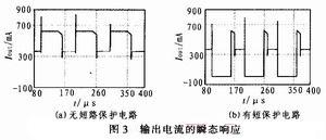 圖3(b)所示曲線的仿真條件與圖3(a)的條件一樣。仿真結果表明當輸出發(fā)生短路時(即負載為0),輸出電流被限制為O,即功率MOS管被完全關斷,同時表明系統(tǒng)具有自動恢復的特點,即負載短路消除后,系統(tǒng)恢復正常工作。