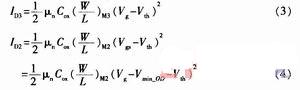 接下來將分析VM2、VM3和VM4組成的網絡如何確保Vmin_OD大于0。分析電路可知,VM2、VM3工作在飽和區(qū),VM4工作在線性區(qū),因此ID3>ID4,ID4=ID2。