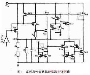 在限流電路的基礎上,設計改進一個短路保護電路,確保在短路情況下,徹底關斷功率MOS管,減少短路發(fā)生時系統(tǒng)損失的功耗。同時該電路具有以下特點:高可靠性、自動恢復,即使地平面存在大量噪聲,當短路發(fā)生時,穩(wěn)壓器的功率管截止,實現保護,而短路一旦消除,穩(wěn)壓器的輸出將自動恢復到正常狀態(tài),有效地保護系統(tǒng)。在藍牙功率放大器電源管理電路中得到了很好應用。