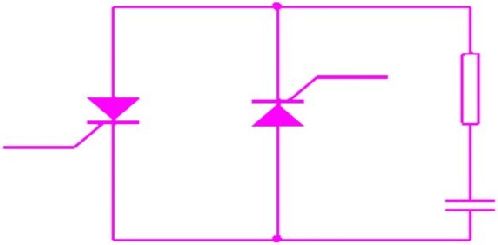 在晶閘管兩端并聯r-c阻容吸收回路,如圖2所示,利用電容吸收過壓。其實質就是將造成過電壓的能量變成電場能量儲存到電容中,然后釋放到電阻中消耗掉。