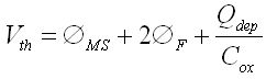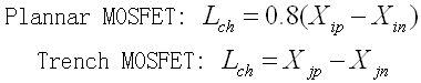 可見閾值電壓主要與基區(qū)摻雜濃度(p-)、柵氧化層厚度(Toxg)、耗盡層電荷(Qdep)相關(guān)。式中前兩項(xiàng)因子對Trench MOSFET和Plannar MOSFET而言相同,而第三項(xiàng)則不同,因?yàn)楹谋M層電荷與溝道長度有關(guān),兩者的溝道長度表達(dá)式為