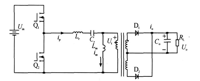 圖1 所示為LLC 諧振變換器的原理圖。 串聯諧振電感Lr 、串聯諧振電容Cr 和并聯諧振電感Lm ,構成LLC 諧振網絡, Cr 也起到隔直作用[3 ] . 在變壓器次級,整流二極管直接連接到輸出電容Co上。