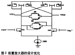 傳統的前置放大器結構如圖2所示,這種內置正反饋比較器由一個差分輸入對,一個偽電流源和一對交叉耦臺負載組成,負載連接成差分的模式。M1和M2組成差分輸入對,M3、M33、M4、M44組成帶有正反饋的負載,以提高電路的增益,這個正反饋單元電路可以通過調整M3、M4和M33、M44管的寬長比(W/L)來形成弱正反饋或強正反饋。
