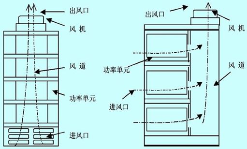 高壓變頻器常風的冷卻方式主要為散熱器強制風冷、循環水冷卻和熱管冷卻等。因強制風冷方式簡單,不存在水冷時的凝露問題,以及熱管散熱器設計的復雜性,在確定合適的通風結構的情況下,一般采用此種方式。采用強制風冷方式需要在結構設計時考慮散熱風道。散熱風道的設計應在充分考慮單元散熱的要求下,應盡量優化。常見的多電平串聯方式的高壓變頻器,從結構上分為功率柜體、變壓器柜、控制柜。功率柜風道設計通常有兩種方式:串聯風道和并聯風道。