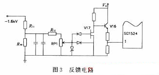 高壓經R30,R31分壓濾波送至場效應管V17,經V17電壓放大后,再經射隨器輸出,送至SG1524的1端。假設電源電壓降低或負載電阻變小引起輸出電壓降低時,則反饋到SG1524內的誤差放大器反相輸入端1的電壓將減小,誤差放大器輸出電壓將增加,從而使加到脈寬調制比較器反相輸入端電壓增大,輸出晶體管的導通時間變大,故功率晶體管導通時間也變長,占空比Q變大,從而使輸出電壓Vo能回到原來的穩定值。反饋電路如圖3所示。
