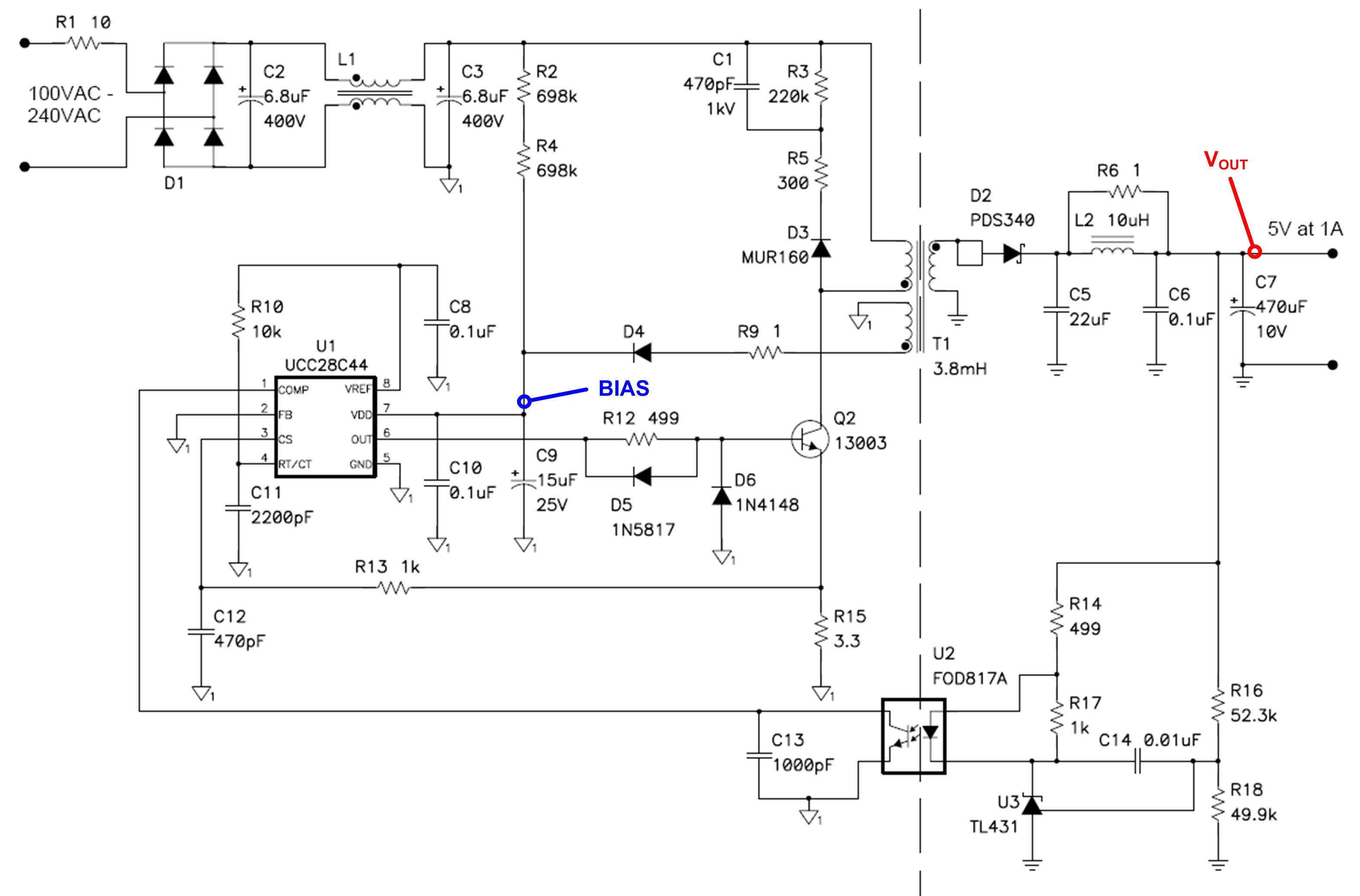 圖 2 這種5V/5W反向通過限制峰值變壓器電流實現(xiàn)功率限制。