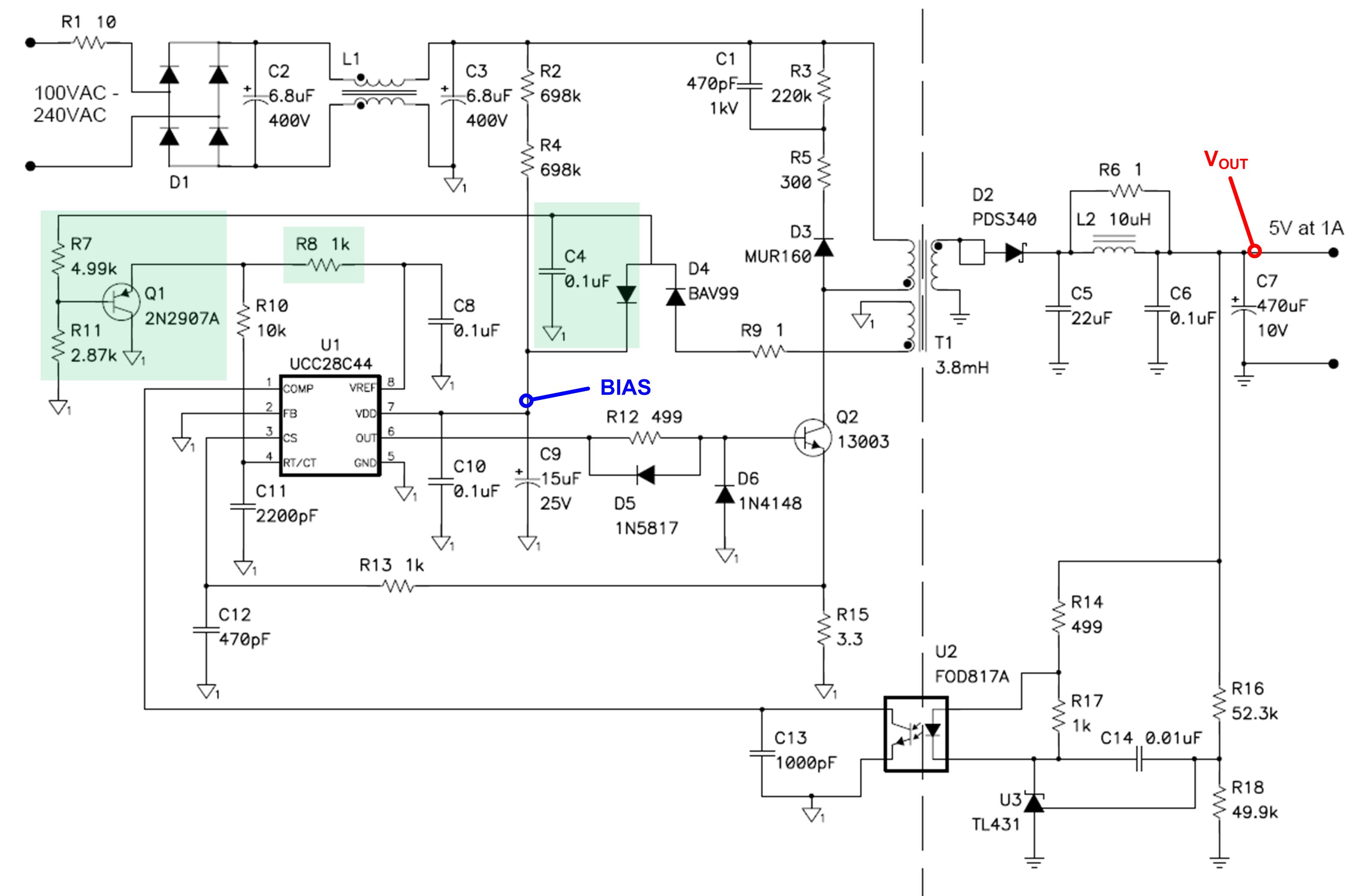 添加這些組件的結(jié)果如圖5所示。同前面一樣,電源進入功率限制時輸出電壓和偏置電壓均開始下降。一旦偏置電壓降至足以開啟Q1的程度,負載電流的任何繼續(xù)增加都會使開關(guān)頻率降低,其反過來又會降低供給負載的有效功率。這會加快過電流關(guān)閉過程。注意,在輸出電流和輸出電壓之間仍然存在一定程度的相互關(guān)系,這是因為變壓器內(nèi)部的偏置繞組耦合和有限的Q1增益。盡管存在這些缺點,但是增加的電路還是極大地改善了V-I特性。實際上,電源現(xiàn)在不會向故障負載提供1.5A以上的電流。