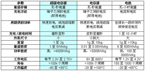 與電池相比,超級電容器能提供更大的峰值功率,具有更小的外形尺寸,在更寬的工作溫度范圍內具有更長的充電周期壽命,還具有更低的等效串聯電阻 (ESR),可提供更高的功率密度。與標準陶瓷、鉭或電解質電容器相比,超級電容器以類似的外形尺寸和重量,提供更高的能量密度。通過降低超級電容器的 Top-Off 電壓,并避開高溫 (>50°C),可以最大限度地延長超級電容器的壽命。下表 1 比較了超級電容器、電容器和電池的關鍵特點。