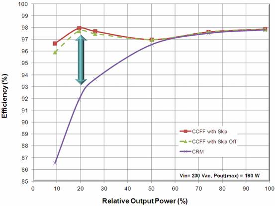 采用CCFF控制架構(gòu),最大的好處莫過于提升能效。采用傳統(tǒng)CrM(臨界導(dǎo)電模式)/BCM(邊界線導(dǎo)電模式),在負載降低時,開關(guān)頻率上升;負載極低時,控制器可能進入“跳周期模式”,滋生可聽噪聲。而采用CCFF控制架構(gòu),可以在負載降低時降低開關(guān)頻率,減小功率損耗;在輕載時,控制器可以鉗位高于可聽噪聲頻段的較低頻率;負載極低時,則采用跳周期模式工作(可以輕易關(guān)閉)。因此,這種谷底導(dǎo)通可進一步提升能效,減小電磁干擾。圖4比較了基于NCP1611CCFF PFC及傳統(tǒng)CrM PFC在不同負載條件下的能效。由圖中可見,在10%輕載條件下,基于帶跳周期模式的NCP1611的演示板的能效高達近97%(關(guān)閉跳周期模式下也達近96%),而基于傳統(tǒng)CrM架構(gòu)的演示板能效僅為近87%,相關(guān)近10%。可見NCP1611在提升電源輕載能效方面表現(xiàn)尤為優(yōu)異。