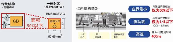 此次羅姆采用獨創的微細加工技術,開發出片上變壓器工藝,進而成功開發出小型并且內置了絕緣元件的柵極驅動器。無需外置零件,同時通過采用小型封裝,與傳統產品相比,安裝面積減少了約50%。不僅如此,由于內置車載逆變器電路所需的全部保護功能,不僅有助于實現逆變器的小型化,還非常有助于減輕設計負擔。