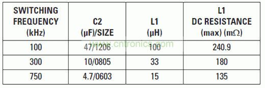 本例中,我們可以通過750-kHz開關(guān)頻率來產(chǎn)生一個(gè)5-V輸出電壓(參見表2)。但是,如果該頻率為1 MHz,則最低可能輸出電壓被限制為約6V;否則,DC/DC轉(zhuǎn)換器會(huì)跳過脈沖。替代方法是降低輸入電壓或者頻率。在選擇某個(gè)開關(guān)頻率以前,你最好是先查看DC/DC轉(zhuǎn)換器數(shù)據(jù)表,了解保證最小可控“導(dǎo)通”時(shí)間。