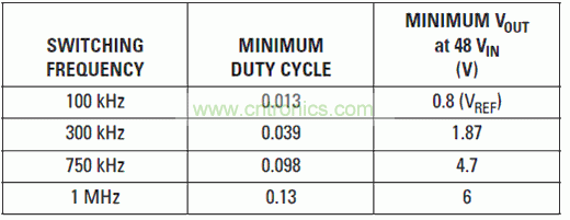 最小可控“導(dǎo)通”時(shí)間限制是DC/DC轉(zhuǎn)換器IC的一個(gè)特點(diǎn),其為脈寬調(diào)制(PWM)電路的最窄可達(dá)脈寬。在降壓轉(zhuǎn)換器中,開關(guān)周期期間功率MOSFET導(dǎo)通的時(shí)間百分比被稱作占空比,其等于輸出電壓與輸入電壓的比。使用TPS54160轉(zhuǎn)換器時(shí),占空比為0.104(4 V/48 V),而數(shù)據(jù)表中列出的最小“導(dǎo)通”時(shí)間為130 ns。可控脈寬限制產(chǎn)生一個(gè)最小可達(dá)占空比,而用最小“導(dǎo)通”時(shí)間乘以開關(guān)頻率,我們可以輕松地計(jì)算出該占空比的大小。一旦知道了最小占空比,利用VIN乘以最小占空比,我們便可以計(jì)算出最低可達(dá)輸出電壓。最低輸出電壓同樣也受轉(zhuǎn)換器基準(zhǔn)電壓的限制,使用TPS54160時(shí)其為0.8V。