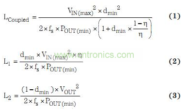 方程式計算得到最大輸入電壓和最小負載時 CCM 運行所需的最小電感。50% 占空比運行(VIN 等于 VOUT 時出現)和統一效率條件下,比較這些方程式可知,方程式 1 中耦合電感的計算值是非耦合電感計算值的兩倍。由于轉換器肯定會有損耗,而大多數輸入電壓源均有很大不同,因此這種簡化了的電感泛化一般為錯誤的;但它通常足以應付除極端情況以外的所有情況。它一般意味著,轉換器會比預期稍快一點進入非連續導通模式 (DCM) 運行,其在大多數情況下仍然可以接受。如前所述,使用非耦合電感時,正如我們通常假設的那樣,無需輸出端電感的值與輸入端電感一樣;但是為了簡單起見肯定會這樣做。利用 VOUT/VIN 調節輸入端電感,便可確定輸出端電感值。使用更小值輸出端電感的好處是,它一般尺寸更小而且成本更低。