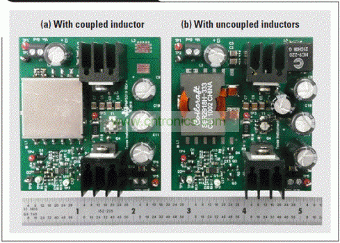 圖 2 顯示了使用一個耦合電感的原型 SEPIC的 示意圖。若想在設計中實施非耦合電感,只需在相同 PWB 上用兩個電感替換耦合電感便可。圖 3 顯示了兩種原型電路。圖 3b 中,L1 占用了耦合電感的空間,而 L2 則位于右上角。