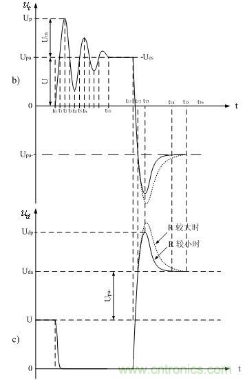 這里順便指出,圖6-b的波形是很難測量到的,因為分布電感Ls與分布電容Cs產生自由振蕩的過程,基本上都在變壓器內部的分布電感與分布電容之間進行,用儀器很難直接進行測量;但通過測量變壓器次級線圈的波形,也可以間接測量圖6-b中波形的振幅;而圖6-c的波形可以直接進行測量,兩者的振幅均與分布電感Ls的數值大小有關,還與等效電阻R的阻值有關。分布電感Ls的數值越大,振幅也越大,等效電阻R的阻值越大,振幅也越大。