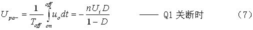 在圖6-b中,Upa為變壓器初級線圈正激輸出電壓的半波平均值,此值與輸入電壓相等;Upa-為變壓器初級線圈反激輸出電壓的半波平均值,此值與占空比相關;當占空比等于0.5時,Upa-與輸入電壓在數值上相等,但符號相反。