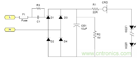 由于恒流二極管需要一定的電壓Vk才能夠進(jìn)入恒流, 所以太低的電源電壓是無(wú)法工作的。通常這個(gè)Vk大約在5-10V左右 所以大多數(shù)采用電池供電的LED是無(wú)法工作的, 最大電流由于恒流二極管的功耗受到限制, 所以過(guò)大的電流也是不合適的。例如1W的LED通常需要350mA, 恒流二極管就很難提供, 目前比較合適的使用場(chǎng)合就是交流市電供電的LED燈具采用很多小功率LED串聯(lián)也就是高壓小電流的情況是最為合適;但是由于恒流二極管的耐壓有一定的限制 所以它所能吸收的電源電壓變化也是有限的。就拿100V耐壓的CRD來(lái)說(shuō)用在220V市電電源里都還只能對(duì)付有限的電壓變化。220V經(jīng)過(guò)橋式整流以后它的輸出直流電壓大約為264V.如果市電變化+10% ~-15%就相當(dāng)于整流后為290~187V, 電壓變化103V.已經(jīng)超過(guò)其耐壓了。因?yàn)長(zhǎng)ED伏安特性的非線(xiàn)性 所以很難用公式來(lái)表示。總之當(dāng)市電電壓降低時(shí)LED中的電流就會(huì)隨市電電壓的降低而降低。其亮度也會(huì)跟著變。 典型應(yīng)用電路中圖3為典型的應(yīng)用電路, 圖4為加了阻容降壓的應(yīng)用電路為了應(yīng)對(duì)低電壓的輸出場(chǎng)合。