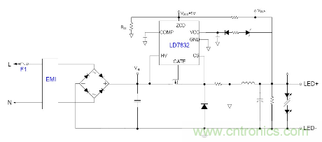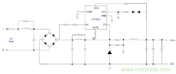 隨著目前法規(guī)和能效的需求, 針對(duì)LED應(yīng)用提出高PF以及適應(yīng)全電壓范圍都能可靠工作的要求, 并且朝小型化方面發(fā)展, 因此之前的填谷式的PFC電路也需要增加兩個(gè)高壓電容因體積的限制不太適合應(yīng)用。有鑒如此, 國(guó)內(nèi)外很多廠商都推出了適應(yīng)球泡燈和T管之類(lèi)的非隔離電源應(yīng)用驅(qū)動(dòng)方案, 下面就以通嘉科技的LD7832做為典型介紹。
