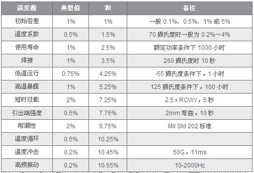 有趣的是,這樣給低壓輸出帶來了更高的精度。許多IC參考電壓范圍為0.6~1.25 V之間,輸出電壓降至這一范圍時會帶來1%或更高的精度。表1給出了您可能需要了解的一些信息,這些信息是典型電阻器產品說明書的電阻誤差術語匯編。在設計中,該列表會較難理解。大多數(shù)工程師都止步于初始容差,然而列表中還有一些或許不應被忽略的誤差項。表格中的每一項都有其微妙的影響。例如,沒有指定具體的溫度系數(shù)范圍,而實際上兩個電阻都可能隨溫度變化以相同方向變化,并且不會在相反的極端。在對一些經驗豐富的設計工程師進行簡單調查后,得出的結論是假設1%容差電阻的2.5%精度可在極端情況和合理成本之間得到一個合理的折中方案。