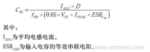 注意,輸入電流在反相降壓/升壓拓撲結構中也是非連續的。假設在接通時輸入電容的能量損耗所引起的輸入電壓偏差小于輸入電壓的5%,則通過下式可計算滿足此要求的最小輸入電容。