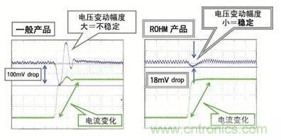 參見表1?;旧希瑑煞N產(chǎn)品都是高效同步整流的降壓型控制器,不僅在重負(fù)載時的效率高,輕負(fù)載時的效率也很高。標(biāo)準(zhǔn)電壓為0.75V/0.7V,適用低電壓,±1%的精度對于前述的±3%的精度來說具有充分的余量。不僅如此,通過ROHM獨創(chuàng)的H3RegTM控制模式實現(xiàn)了高速負(fù)載瞬態(tài)響應(yīng)(圖4),非常適合用作FPGA電源。