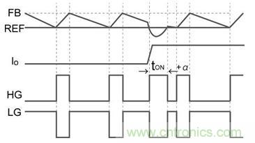 ●tON后HG一旦關(guān)斷,低邊MOSFET的柵極(LG)導(dǎo)通,F(xiàn)B引腳電壓開始下降,當(dāng)與REF電壓達(dá)到一致時關(guān)斷LG。