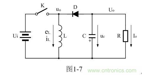 圖1-7中,Ui為輸入電源,K為控制開(kāi)關(guān),L為儲(chǔ)能電感,D為整流二極管,C為儲(chǔ)能濾波電容,R為負(fù)載電阻。當(dāng)控制開(kāi)關(guān)K接通的時(shí)候,輸入電源Ui開(kāi)始對(duì)儲(chǔ)能電感L加電,流過(guò)儲(chǔ)能電感L的電流開(kāi)始增加,同時(shí)電流在儲(chǔ)能電感中也要產(chǎn)生磁場(chǎng);當(dāng)控制開(kāi)關(guān)K由接通轉(zhuǎn)為關(guān)斷的時(shí)候,儲(chǔ)能電感會(huì)產(chǎn)生反電動(dòng)勢(shì),使電流繼續(xù)流動(dòng),并通過(guò)整流二極管D進(jìn)行整流,再經(jīng)電容儲(chǔ)能濾波,然后向負(fù)載R提供電流輸出。控制開(kāi)關(guān)K不斷地反復(fù)接通和關(guān)斷過(guò)程,在負(fù)載R上就可以得到一個(gè)負(fù)極性的電壓輸出。