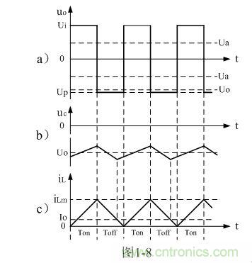 圖1-8、圖1-9、圖1-10分別是控制開(kāi)關(guān)K的占空比D等于0.5、< 0.5、> 0.5時(shí),圖1-7電路中幾個(gè)關(guān)鍵點(diǎn)的電壓和電流波形。圖1-8-a)、圖1-9-a)、圖1-10-a)分別為控制開(kāi)關(guān)K輸出電壓uo的波形;圖1-8-b)、圖1-9-b)、圖1-10-b)分別為儲(chǔ)能濾波電容兩端電壓uc的波形;圖1-8-c)、圖1-9-c)、圖1-10-c)分別為流過(guò)儲(chǔ)能電感L電流iL的波形。應(yīng)該特別注意的是,圖1-8-c)、圖1-9-c)、圖1-10-c)中的電流波形按原理應(yīng)該取負(fù)值,但取負(fù)值后反而覺(jué)得與前面圖1-5與圖1-6不好對(duì)比和分析,因此,當(dāng)進(jìn)行具體計(jì)算時(shí),一定要注意電流和電壓的方向。