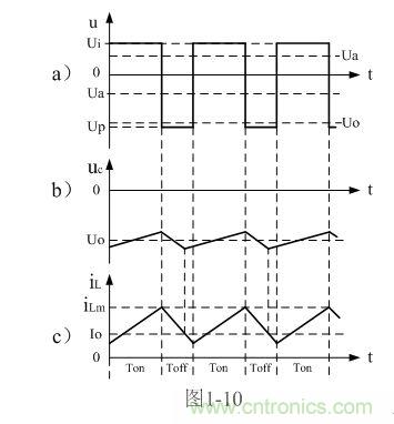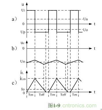 順便指出,反轉(zhuǎn)式串聯(lián)開(kāi)關(guān)電源輸出電壓為負(fù)脈沖,當(dāng)圖1-7中的濾波電容器C開(kāi)路時(shí),負(fù)脈沖的幅度將非常高,負(fù)脈沖是一個(gè)幅度按指數(shù)規(guī)律下降的尖脈沖,其幅度主要由負(fù)載電阻的大小,以及占空比來(lái)決定;當(dāng)圖7中的濾波電容器C接入后,反轉(zhuǎn)式串聯(lián)開(kāi)關(guān)電源輸出電壓uo為一負(fù)方波,此方波我們可稱之為半波平均值,關(guān)于半波平均值的概念我們后面還會(huì)詳細(xì)解釋。