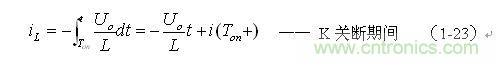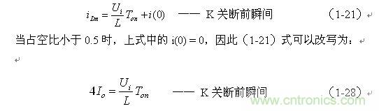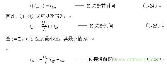 上式中i(Ton+)為控制開(kāi)關(guān)K從Ton轉(zhuǎn)換到Toff的瞬間流過(guò)電感的電流,i(Ton+)也可以寫為i(Toff-),即:控制開(kāi)關(guān)K關(guān)斷或接通瞬間,之前和之后流過(guò)電感L的電流相等。實(shí)際上(1-23)式中的i(Ton+)就是(1-21)式中的iLm,即: